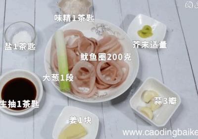 发布时间: 15小时前步骤1准备食材:鱿鱼圈200克、生抽1茶匙、姜1块、大葱1段、蒜3瓣、盐1茶匙、味精1茶匙、芥末适量 。步骤2葱切段 。步骤3姜切片 。步骤4蒜切片 。步骤5鱿鱼圈洗净备用 。步骤6锅中倒入清水、葱、姜、蒜、盐、味精 。水煮开后,加入鱿鱼圈...