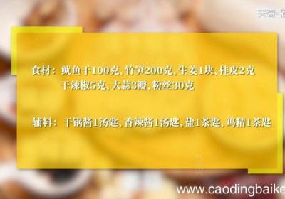 发布时间: 13小时前步骤1鱿鱼干100克,竹笋200克,生姜1块,桂皮2克,干辣椒5克,大蒜3瓣,粉丝30克、干锅酱1汤匙,香辣酱1汤匙,盐1茶匙,鸡精1茶匙步骤2淡干鱿鱼浸泡1小时,粉丝加入清水泡软 。步骤3姜切丝 。步骤4蒜切丝 。步骤5干辣椒剪成丝 。步...