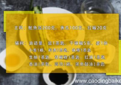 发布时间: 12小时前步骤1准备食材:干鱿鱼1个、干辣椒20个、蒜3瓣、姜3克、食用油10克、盐1克、生抽2克、鸡精2克、小茴香1克、八角1个、桂皮2克、香叶1片、白芝麻10克 。步骤2干辣椒切丝 。步骤3蒜切片 。步骤4姜切丝 。步骤5干鱿鱼剪细丝 。步骤6用...
