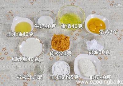 发布时间: 14小时前步骤1准备食材:低粉40克、玉米淀粉5克、奶油30克、肉松20克、牛奶40克、蛋黄3个、蛋清40克、玉米油40克、细砂糖40克、柠檬汁几滴 。步骤2碗中倒入牛奶,加入玉米油、10克细砂糖,混合均匀,搅拌成乳白状 。步骤3再加入蛋黄,搅拌均匀...