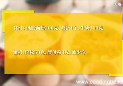 发布时间: 14小时前步骤1食材:低筋面粉200克、鸡蛋1个、牛奶100克 。辅料:肉松50克、酵母粉3克、油少许 。步骤2碗中倒入低筋面粉、酵母粉、清水搅拌均匀,揉成一个光滑面团,盖上保鲜膜发酵 。步骤3鸡蛋打入碗中,打散 。步骤4热锅喷油,倒入鸡蛋液,煎至蛋...