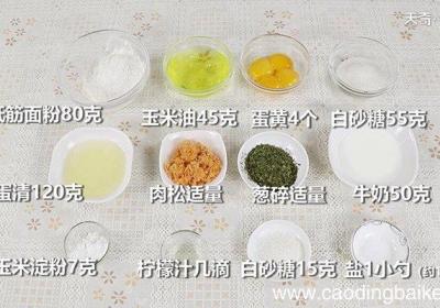 步骤1准备食材:低筋面粉80克、玉米淀粉7克、蛋清120克、蛋黄4个、牛奶50克、玉米油45克、肉松适量、葱碎适量、柠檬汁几滴、盐1小勺(约1.6克)、白砂糖55克、白砂糖15克 。步骤2碗中加入蛋黄,放入15克白砂糖、加入牛奶、玉米油,用...