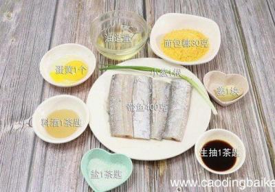 步骤1准备食材:带鱼200克、姜1块、料酒1茶匙、盐1茶匙、油适量、生抽1茶匙、小葱1根、蛋黄1个、面包糠30克 。步骤2带鱼洗净切段 。步骤3姜切片 。步骤4小葱切葱花 。步骤5碗中放入带鱼、料酒、生抽、姜、盐,拌匀腌制2小时 。步骤6然...