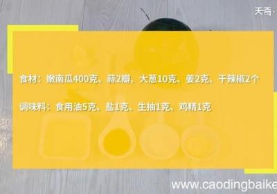 步骤1食材:嫩南瓜400克、蒜2瓣、大葱10克、姜2克、干辣椒2个 。调味料:食用油5克,盐1克,生抽1克,鸡精1克 。步骤2嫩南瓜洗净,切成薄片 。步骤3姜切末 。步骤4【炒南瓜的做法 炒南瓜这么做】蒜切末 。步骤5大葱切片 。步骤6干辣...