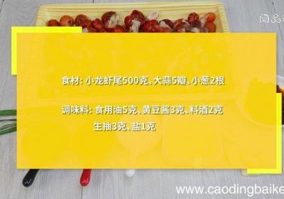 发布时间: 8小时前步骤1食材:小龙虾尾500克、大蒜5瓣、小葱2根 。调味料:食用油5克、黄豆酱3克、料酒2克、生抽3克、盐1克 。步骤2大蒜切末 。步骤3小葱切段 。步骤4炒锅中油温5成热时,下入蒜末爆香,放入小龙虾尾炒匀,加入黄豆酱、料酒、生抽、盐,炒匀...