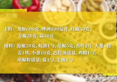 发布时间: 8小时前步骤1准备食材:龙虾600克、啤酒100毫升、红椒50克、青椒20克、蒜50克、泡椒20克、花椒5克、香叶2片、大葱1段、姜1块、小葱10克、色拉油适量、鸡精1勺、胡椒粉适量、盐1勺、生抽1勺、蚝油1勺 。步骤2蒜切末,小葱切葱花姜切末,大...