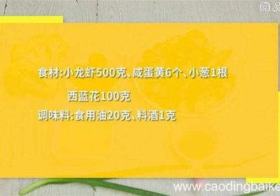 发布时间: 8小时前步骤1食材:小龙虾500克、咸蛋黄6个、小葱1根、西蓝花100克 。调味料:食用油20克、料酒1克 。步骤2咸蛋黄中加入料酒,蒸锅中放水煮沸,放入咸蛋黄隔水蒸10分钟,取出,压成泥 。步骤3小葱切葱花 。步骤4西蓝花掰成小朵,放入沸水锅中焯...