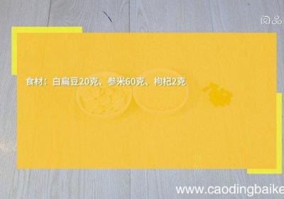 发布时间: 11小时前步骤1食材:白扁豆20克,参米60克,枸杞2克 。步骤2白扁豆用清水泡4小时 。步骤3参米洗净,放入砂锅,加600毫升清水、白扁豆,煮沸后,转中小火煮50分钟,放入枸杞,煮10分钟即可 。【白扁豆参米粥的做法 白扁豆参米粥怎么做】...