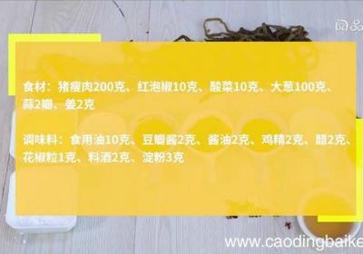 发布时间: 12小时前步骤1食材:猪瘦肉200克,红泡椒10克,酸菜10克,大葱100克,蒜2瓣,姜2克调味料:食用油10克,豆瓣酱2克,酱油2克,鸡精2克,醋2克,花椒粒1克,料酒2克,淀粉3克步骤2猪瘦肉切丝,加料酒、淀粉,拌匀,腌制15分钟 。步骤3蒜切片...