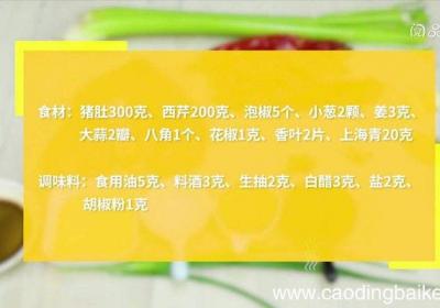 发布时间: 8小时前步骤1食材:猪肚300克、西芹200克、泡椒5个、小葱2颗、姜3克、大蒜2瓣、八角1个、花椒1克、香叶2片、上海青20克 。调味料:食用油5克、料酒3克、生抽2克、白醋3克、盐2克、胡椒粉1克 。步骤2上海青对半切开,放入沸水锅中焯烫40秒...