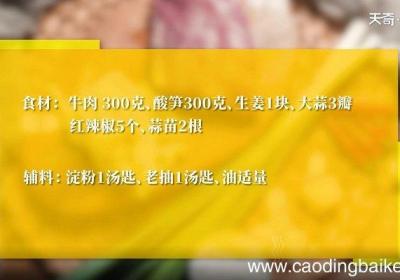 发布时间: 7小时前步骤1食材:牛肉300克,酸笋300克,生姜1块,大蒜3瓣,小米椒5个,蒜苗2根 。调料:淀粉2克,老抽3克,盐半茶匙 。步骤2蒜苗切段 。步骤3红辣椒切段 。【酸笋炒牛肉的做法 酸笋炒牛肉怎么做】步骤4姜、蒜切末,酸笋洗净沥干 。步骤5牛...