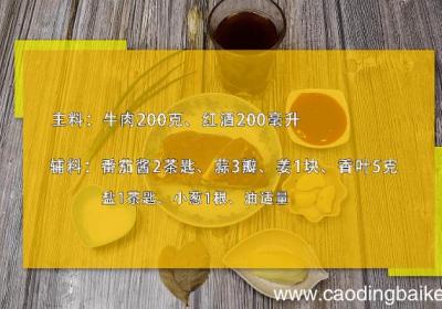 发布时间: 7小时前步骤1准备食材:牛肉200克、红酒200毫升、番茄酱2茶匙、蒜3瓣、姜1块、香叶5克、盐1茶匙、小葱1根、油适量 。步骤2牛肉洗净切小块 。步骤3蒜切片 。步骤4姜切片 。步骤5小葱切葱花 。步骤6首先起锅烧水,水热下入牛肉焯水2分钟,捞出...