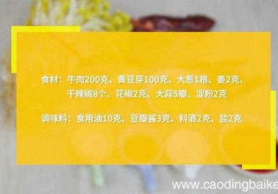 发布时间: 7小时前步骤1食材:牛肉200克、黄豆芽100克、大葱1根、姜2克、干辣椒8个、花椒2克、大蒜5瓣、淀粉2克、食用油10克、豆瓣酱3克、料酒2克、盐2克 。步骤2大葱切末 。步骤3姜切末 。步骤4干辣椒切小段 。步骤5大蒜切末 。步骤6牛肉切片 。...