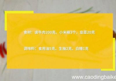 发布时间: 7小时前步骤1食材:卤牛肉200克、小米椒3个、韭菜20克、小葱1根、食用油5克、生抽2克、白糖1克 。步骤2卤牛肉切片 。步骤3放入生抽、白糖拌匀,摆入盘中 。步骤4小米椒切小圈 。步骤5韭菜切小段 。步骤6将小米椒、韭菜、葱花摆在牛肉上,热锅烧...