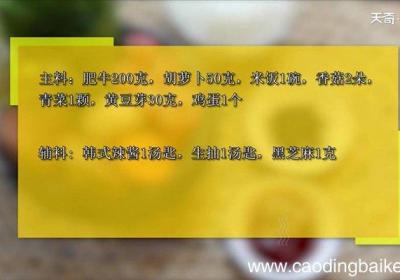 发布时间: 9小时前步骤1食材:肥牛200克,胡萝卜50克,米饭1碗,香菇2朵,青菜1颗,黄豆芽30克,鸡蛋1个 。调料:韩式辣酱1汤匙,生抽1汤匙,黑芝麻1克 。步骤2胡萝卜切丝 。步骤3青菜切碎 。步骤4香菇切片 。步骤5锅中沸水,放入香菇焯水1分钟捞出沥...