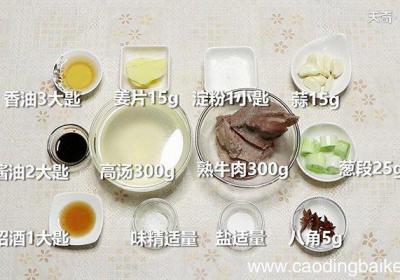 发布时间: 9小时前步骤1准备食材:熟牛肉300g、葱段25g、姜片15g、蒜15g、八角5g、淀粉1小匙、高汤300g、盐适量、味精适量、绍酒1大匙、酱油2大匙、香油3大匙 。步骤2将熟牛肉切成厚片,然后改刀切成条,装入盘中备用 。步骤3蒜拍碎,放入碟中备用...