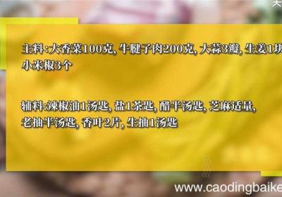 发布时间: 9小时前步骤1所需食材:大香菜100克,牛腱子肉200克,大蒜3瓣,生姜1块,小米椒3个 。所需调料:辣椒油1汤匙,盐1茶匙,醋半汤匙,芝麻适量,老抽半汤匙,香叶2片,生抽1汤匙 。步骤2牛肉放入高压锅,加香叶,老抽,盐,生姜 。步骤3倒入清水,中...