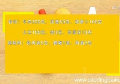 发布时间: 9小时前步骤1食材:牛肉300克、洋葱50克、胡萝卜100克、土豆100克、姜3克、西蓝花10克 。调味料:食用油5克、咖喱1盒、料酒2克 。步骤2西蓝花放入沸水锅中,焯烫30秒,捞出备用 。步骤3姜切片 。步骤4洋葱切块 。步骤5胡萝卜切块 。步...