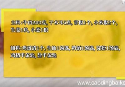 发布时间: 9小时前步骤1所需食材:牛肉200克,干木耳5克,青椒1个,小米椒2个,生姜1块,小葱1根 。所需调料:鸡蛋清1个,生抽1汤匙,料酒1汤匙,淀粉1汤匙,鸡精半茶匙,盐半茶匙 。步骤2干木耳倒入清水泡发,撕小朵 。步骤3青椒切块 。步骤4牛肉切片,放...