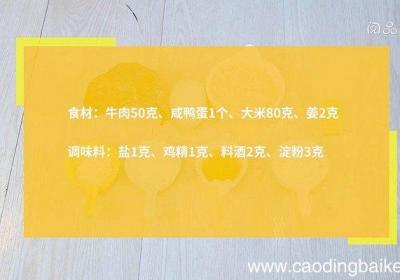 发布时间: 5小时前【蛋黄碎牛肉粥的做法 蛋黄碎牛肉粥怎么做】步骤1食材:牛肉50克、咸鸭蛋1个、大米80克、姜2克、盐1克、鸡精1克、料酒2克、淀粉3克 。步骤2咸鸭蛋取出蛋黄 。步骤3压碎 。步骤4姜切丝 。步骤5牛肉剁碎、加入姜丝、料酒、淀粉、拌匀、腌制...
