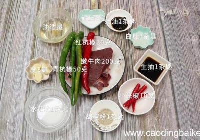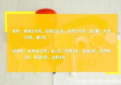 发布时间: 5小时前步骤1食材:青椒200克,红椒150克,牛肉150克,蒜2瓣,大葱20克,姜3克、食用油10克,盐1克,鸡精2克,生抽3克,孜然粉2克,料酒3克,淀粉4克 。步骤2牛肉切薄片,加入料酒、淀粉,拌匀,腌制15分钟 。步骤3青椒切块 。步骤4红...