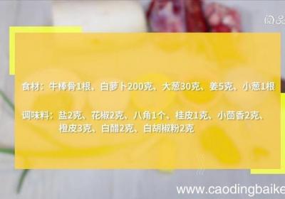 发布时间: 5小时前步骤1食材:牛棒骨1根、白萝卜200克、大葱30克、姜5克、小葱1根调味料:盐2克、花椒2克、八角1个、桂皮1克、小茴香2克、橙皮3克、白醋2克、白胡椒粉2克步骤2牛棒骨洗净、买的时候让店家把骨头敲断 。步骤3白萝卜切滚刀块 。步骤4大葱切...