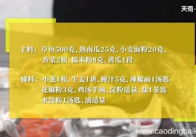 发布时间: 11小时前步骤1食材:草鱼1条、熟南瓜15克、小麦面粉20克、糯米粉5克、香菜2根、黄瓜1段、小葱1根、大蒜2瓣、生姜1块、鲍汁5克、辣椒面1汤匙、花椒粉3克、鸡汤半碗、淀粉1汤匙、盐1茶匙、水淀粉1汤匙 。步骤2将蒸熟的南瓜打成泥,加入1勺白糖、小...