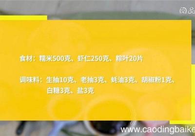 发布时间: 8小时前步骤1食材:糯米500克、虾仁250克、粽叶20片、生抽10克、老抽3克、蚝油3克、胡椒粉1克、白糖3克、盐3克 。步骤2糯米浸泡1小时,捞出,加入7克生抽、老抽、2克蚝油、2克白糖、2克盐,拌匀腌制30分钟 。步骤3虾仁中加入3克生抽、1...