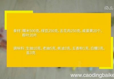 发布时间: 7小时前步骤1食材:糯米500克、绿豆250克、五花肉250克、咸蛋黄20个、粽叶20片、生抽10克、老抽5克、蚝油3克、五香粉1克、白糖3克、盐3克 。步骤2绿豆提前浸泡3小时 。步骤3糯米浸泡1小时 。步骤4盆中放入糯米、绿豆、7克生抽、3克老...