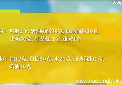 发布时间: 15小时前步骤1所需食材:鸡蛋2个、奶油30克、奶酪30克、牛奶50克、红茶1个、低筋面粉30克、蛋黄1个 。所需调料:白糖50克、油12克 。步骤22个蛋黄中加入5克糖搅匀 。步骤3加入12克油和20克水,搅拌均匀 。步骤4筛入30克低筋面粉拌匀,...