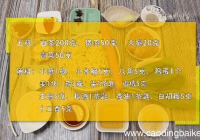 发布时间: 12小时前步骤1准备食材:面条200克、猪肉50克、火腿20克、青菜50克、小葱1根、小米椒5克、八角5克、姜1块、蒜3瓣、盐1茶匙、鸡精5克、生抽5克、白胡椒5克、十三香5克、料酒1茶匙、香油1茶匙 。步骤2猪肉切丝 。步骤3火腿切片 。步骤4青菜...