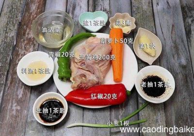 发布时间: 16小时前步骤1准备食材:三黄鸡200克、胡萝卜50克、油适量、盐1茶匙、姜1块、蒜3瓣、老抽1茶匙、料酒1茶匙、生抽1茶匙、青椒20克、红椒20克、小葱1根 。步骤2三黄鸡洗净剁块 。步骤3胡萝卜切小块 。步骤4姜切片 。步骤5蒜切片 。步骤6青椒...