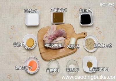 发布时间: 15小时前步骤1准备食材:鸡肉500克、葱5克、熟芝麻10克、味精1勺、熟花椒面1勺、香油1勺、辣椒油1勺、白糖1勺、白醋2勺、酱油1勺、芝麻酱2勺 。步骤2先将大葱切末,装盘备用 。步骤3碗中倒入酱油,然后加入芝麻酱、辣椒油、白醋、香油、葱末、味精...