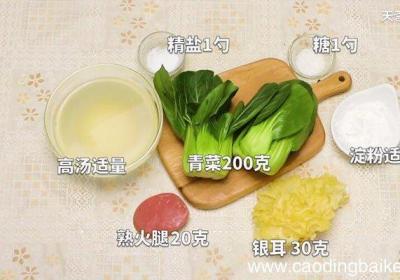 发布时间: 11小时前步骤1准备食材:银耳30克、青菜200克、熟火腿20克、高汤适量、盐1勺、糖1勺、淀粉适量 。步骤2银耳用温水泡发后剪去黄硬蒂 。步骤3熟火腿切细丝 。步骤4青菜入水中汆烫至熟 。步骤5然后把青菜捞起来 。步骤6铺于盘边 。步骤7炒锅烧热,...