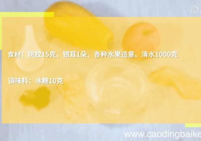 发布时间: 11小时前步骤1准备食材:桃胶15克、银耳1朵、各种水果适量、清水1000克、冰糖10克 。步骤2桃胶用清水提前浸泡12小时 。步骤3银耳用清水泡半小时左右、去除根部、清洗干净、撕成小朵 。步骤4锅中加水、银耳、桃胶、冰糖、大火煮开后转小火继续煮40...