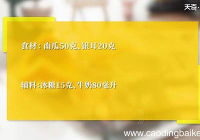 发布时间: 11小时前步骤1食材:南瓜50克、银耳20克,牛奶80毫升,冰糖15克 。步骤2银耳洗净撕成小朵 。步骤3南瓜去皮,切成小块 。步骤4搅拌机中放入南瓜和银耳,加入适量清水,打成蓉 。步骤5再将南瓜蓉倒入锅里 。步骤6加入牛奶搅拌均匀 。步骤7加入冰糖...