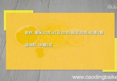 发布时间: 11小时前步骤1食材:薏米30克,红豆30克,银耳30克,红枣2颗 。调味料:冰糖5克 。步骤2薏米用清水浸泡3小时 。步骤3红豆用清水浸泡3小时 。步骤4银耳用清水浸泡2小时 。步骤5红枣去核 。步骤6砂锅中放入银耳、薏米、红豆,倒入700毫升清水...