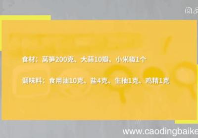 发布时间: 16小时前步骤1准备食材:莴笋200克,大蒜10瓣,小米椒1个,食用油10克,盐4克,生抽1克,鸡精1克 。步骤2莴笋去皮 。步骤3洗净切丝,加入3克盐,拌匀腌制15分钟,挤出多余水份,放入碗中 。步骤4小米椒切末 。大蒜切末 。步骤5锅中倒入食用油...