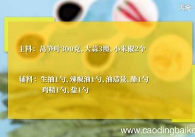 食材:莴笋叶300克、小米椒2个、蒜3瓣、生抽1勺、醋1勺、辣椒油1勺步骤:1、蒜3瓣切末,小米椒2个切圈,莴笋叶摘好洗净,放入清水中浸泡5分钟,捞出控干后,切成大小均匀的段,装入盘中 。2、碗中放入蒜末、小米椒、鸡精半勺、醋1勺、生抽1勺...