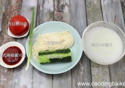 步骤1【冷面汤怎么做 冷面汤怎么做好吃】准备食材:冷面50克、高汤100毫升、黄瓜40克、西红柿30克、小葱1根 。步骤2冷面浸泡10分钟 。步骤3黄瓜洗净切丝 。步骤4西红柿洗净切片 。步骤5小葱切葱花 。步骤6首先起锅倒适量清水,倒入高...