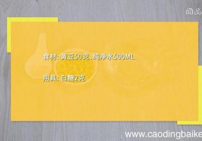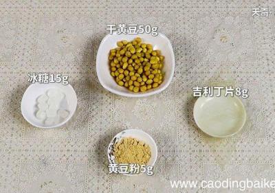 步骤1准备食材:干黄豆50g、冰糖15g、吉利丁片8g、黄豆粉5g 。步骤2黄豆,吉利丁片提前用水浸泡 。步骤3然后将浸泡好的黄豆倒入料理机,加300ml清水,打成豆浆 。步骤4将打好的豆浆倒入锅中,用小火煮沸,然后用细网筛过滤 。步骤5将...