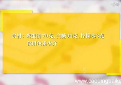 步骤1所需食材:鸡蛋清70克、白糖90克、柠檬水3克、使用色素少许 。步骤2蛋白中加入3克柠檬汁 。步骤3打发起泡,白糖分次加入蛋白中打至发白 。步骤4小碗中加入少许食用色素 。步骤5用吸管装入裱花袋边上 。步骤6再加入一部分蛋白霜 。步骤...