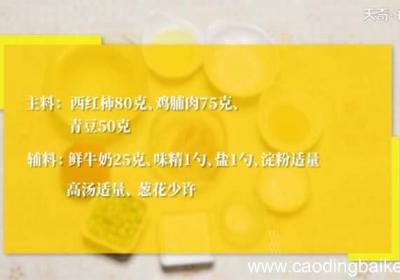 步骤1准备食材: 西红柿80克、鸡脯肉75克、青豆50克、鲜牛奶25克、味精1勺、盐1勺、淀粉适量、高汤适量、葱花少许 。步骤2将洗净的鸡脯肉切成小块 。步骤3鸡脯肉剁成肉末 。步骤4剁好的鸡脯肉放入碗中 。步骤5淀粉倒入牛奶碗中 。步骤6...