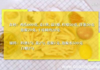 发布时间: 14小时前步骤1食材:鸡爪500克、大葱10克、泡椒10个、姜3克、大蒜3瓣、柠檬1个调味料:生抽5克、醋4克、白糖2克、盐1克、蚝油2克、鸡精1克步骤2大葱切段 。步骤3姜切片 。步骤4大蒜切末 。步骤5柠檬切片 。步骤6泡椒切小段 。步骤7鸡爪冷...