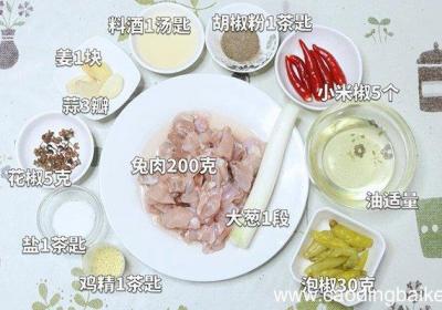 发布时间: 14小时前步骤1准备食材:兔肉200克、泡椒30克、小米椒5个、大葱1段、姜1块、蒜3瓣、花椒5克、料酒1汤匙、盐1茶匙、鸡精1茶匙、胡椒粉1茶匙、油适量 。步骤2小米椒切圈 。步骤3大葱切丁 。步骤4【泡椒兔丁的做法 泡椒兔丁怎么做】泡椒切段 。步...