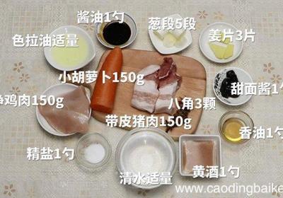步骤1准备食材:带皮猪肉150克、小胡萝卜150克、净鸡肉150克、葱段5段、姜片3片、八角3颗、甜面酱1勺、精盐1勺、酱油1勺、黄酒1勺、香油1勺、清水适量、色拉油适量 。步骤2将猪肉切成4厘米见方的块 。步骤3鸡肉剁成4厘米见方的块 。...