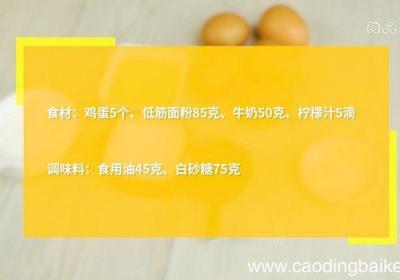 发布时间: 12小时前步骤1鸡蛋5个、低筋面粉60克,柠檬半个、黄油50克、白糖30克、牛奶50ml 。步骤2将鸡蛋磕破,双手拿住蛋壳,手动将蛋黄和蛋清分离 。步骤3在蛋清中挤入少许柠檬汁,这样能帮助蛋清打发,然后加入10克白糖,用打蛋器将蛋清打发 。步骤4在蛋...