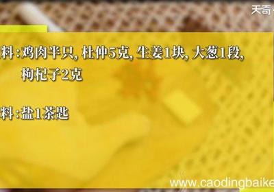 发布时间: 12小时前步骤1所需食材:鸡肉半只,杜仲5克,生姜1块,大葱1段,枸杞子2克 。所需调料:盐1茶匙 。步骤2姜切片,葱切段,鸡肉剁成小块 。步骤3鸡块放入沸水 。步骤4加入料酒去腥 。步骤5焯去血沫,捞出沥干 。步骤6【杜仲炖鸡汤怎么做 杜仲炖鸡汤的...