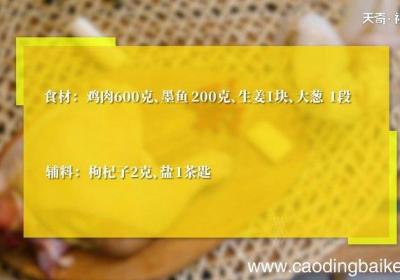 发布时间: 11小时前步骤1食材:鸡肉600克,墨鱼200克,生姜1块,大葱1段 。辅料:枸杞子2克,盐1茶匙 。步骤2墨鱼洗净切块 。步骤3姜切片 。步骤4葱切段 。步骤5鸡肉剁成小块 。步骤6锅中水沸后放入鸡块,加入一勺料酒、焯去血沫,捞出沥干 。步骤7准备...
