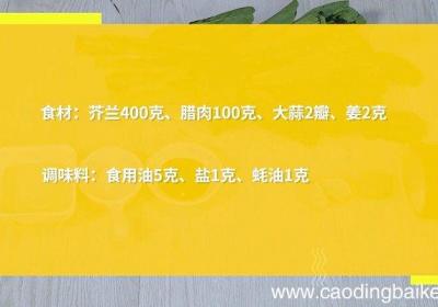 步骤1食材:芥兰400克、腊肉100克、大蒜2瓣、姜2克 。调味料:食用油5克、盐1克、蚝油1克 。步骤2芥兰摘去叶子,切片 。步骤3腊肉切薄片 。步骤4大蒜切片 。步骤5姜切丝 。步骤6热锅倒油,油温5成热时,放入腊肉,煸炒出油 。放入姜...